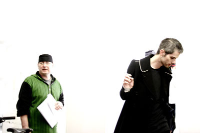 Maria Cyber photo and Comment: Jürgen Brüning (Producer) and Guido Sommer as Adolf at the studio just before we leave for our first shooting day. I manage to "burn" all the background and to focus on Jurgen as he is the "head" of the whole project.